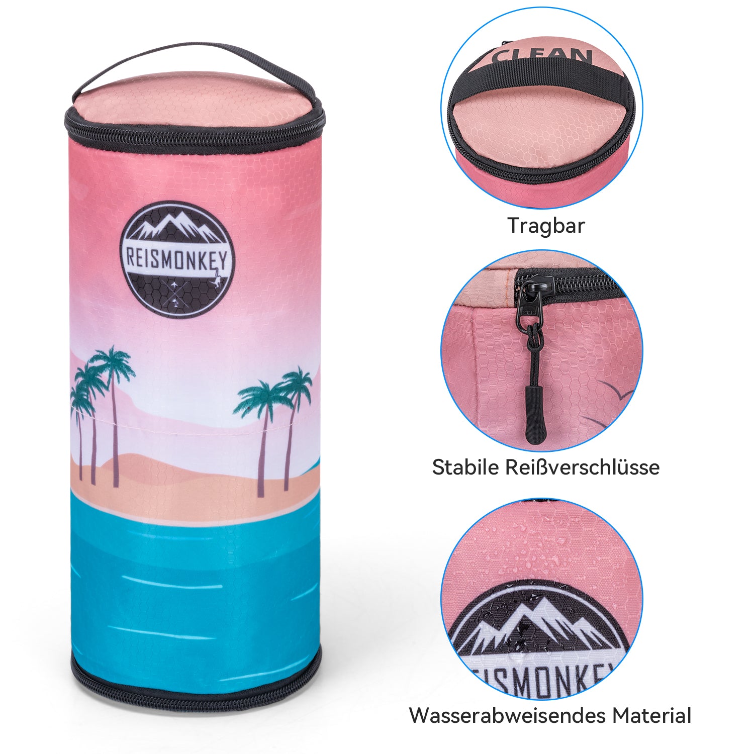 Dieser Artikel ist wirklich einzigartig und nur bei Reismonkey erhältlich. Die coolen Designs weckt sofort die Reiselust. Wähle zwischen Dschungel, Strand, Tal, Insel oder Dunkelblau. Der Würfel hat eine praktische Größe und eine kompakte, zylindrische Form, die problemlos einen leeren Raum in deinem Koffer oder Rucksack füllt.