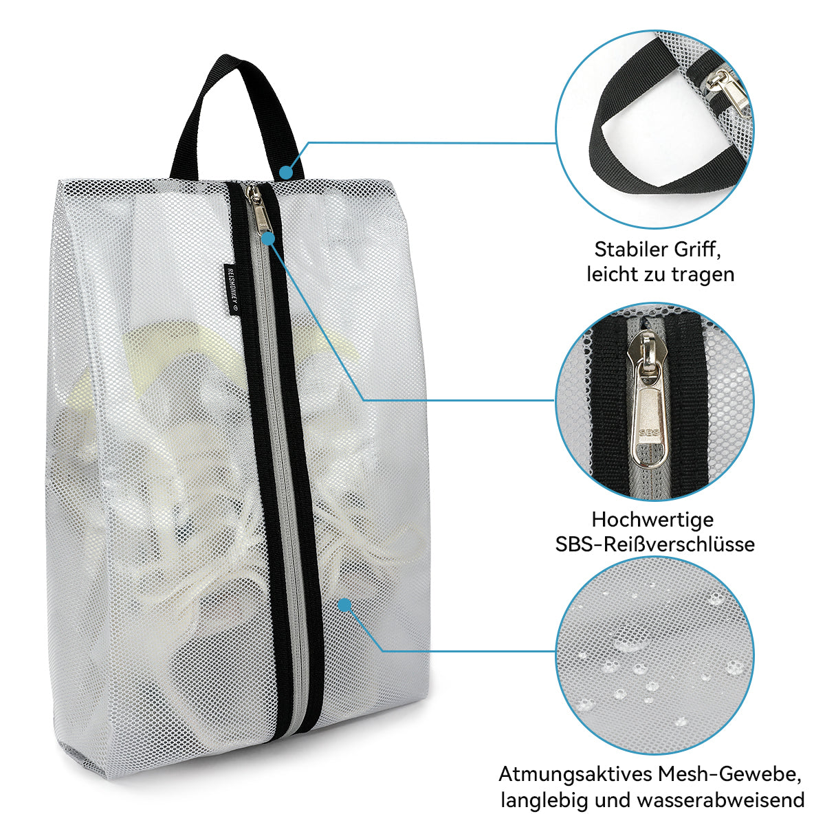 Auch am Strand, beim Wandern oder im Rucksack ist sie praktisch, um Schuhe oder Kleidung sauber und trocken zu transportieren. (Hinweis: Nicht vollständig wasserdicht – Reißverschlüsse sind zu 99 % dicht, aber nicht zum Untertauchen geeignet.)