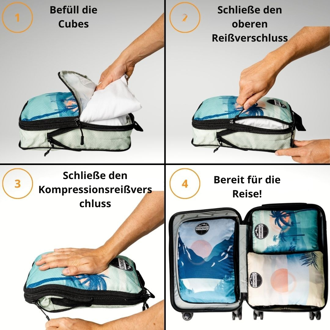➖ Die Funktionsweise der Packing Cubes erfordert zunächst etwas Übung, aber sobald du den Dreh raus hast, wirst du viel Spaß haben. Nachfolgend findest du die Schritt-für-Schritt-Anleitung und Tipps.
