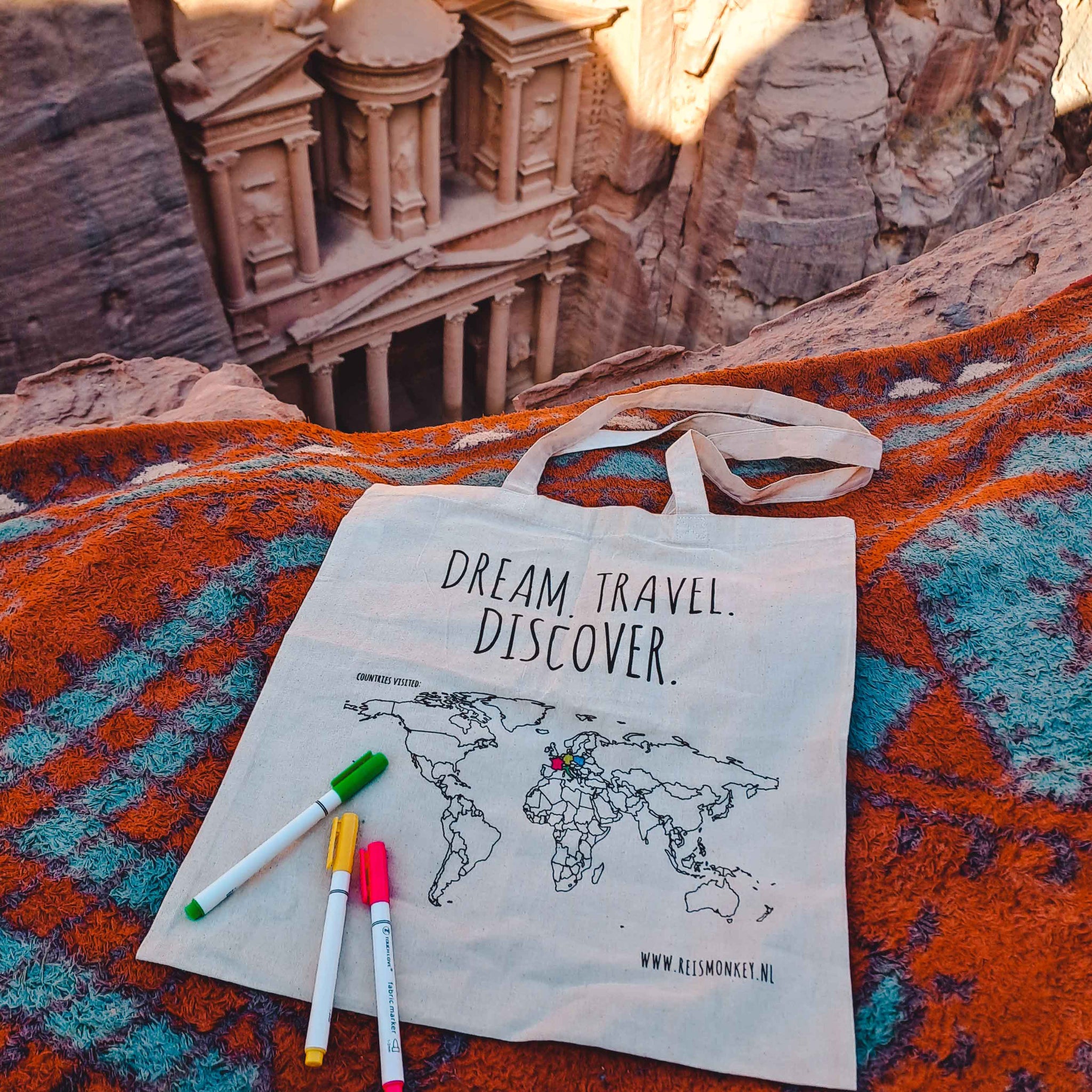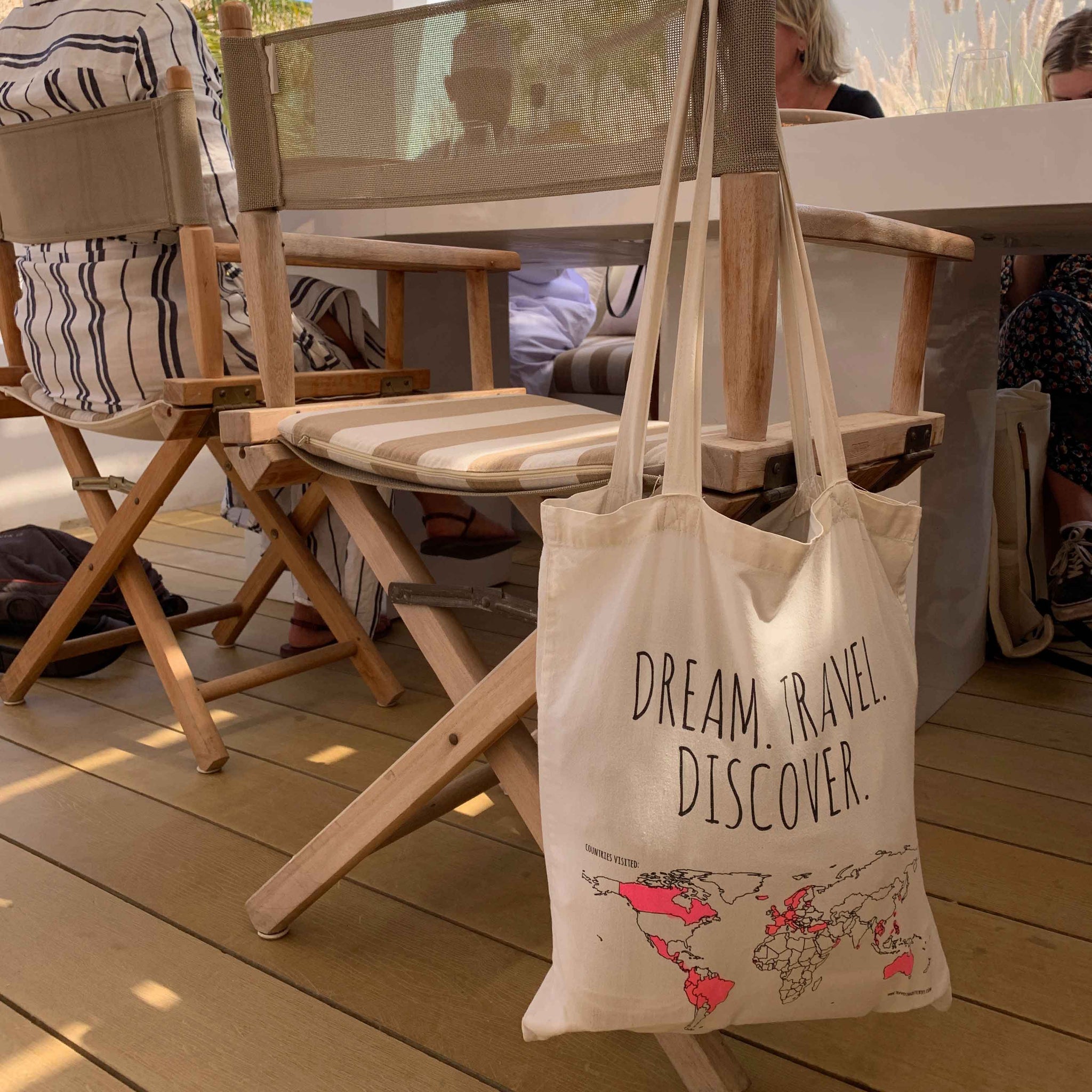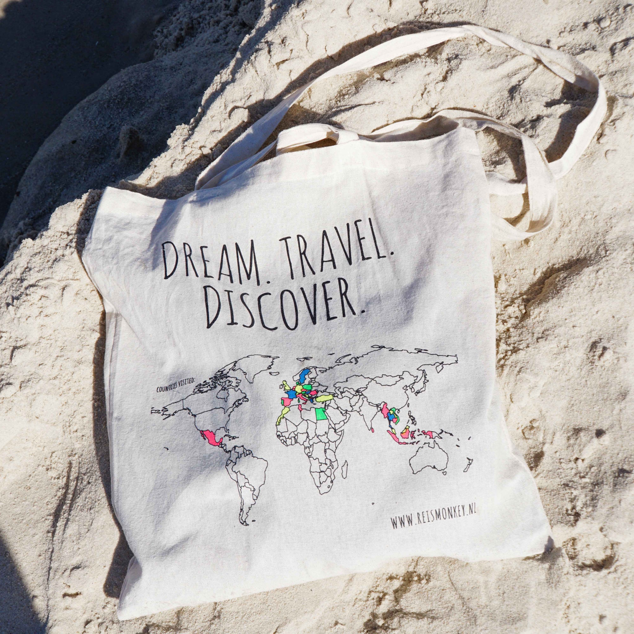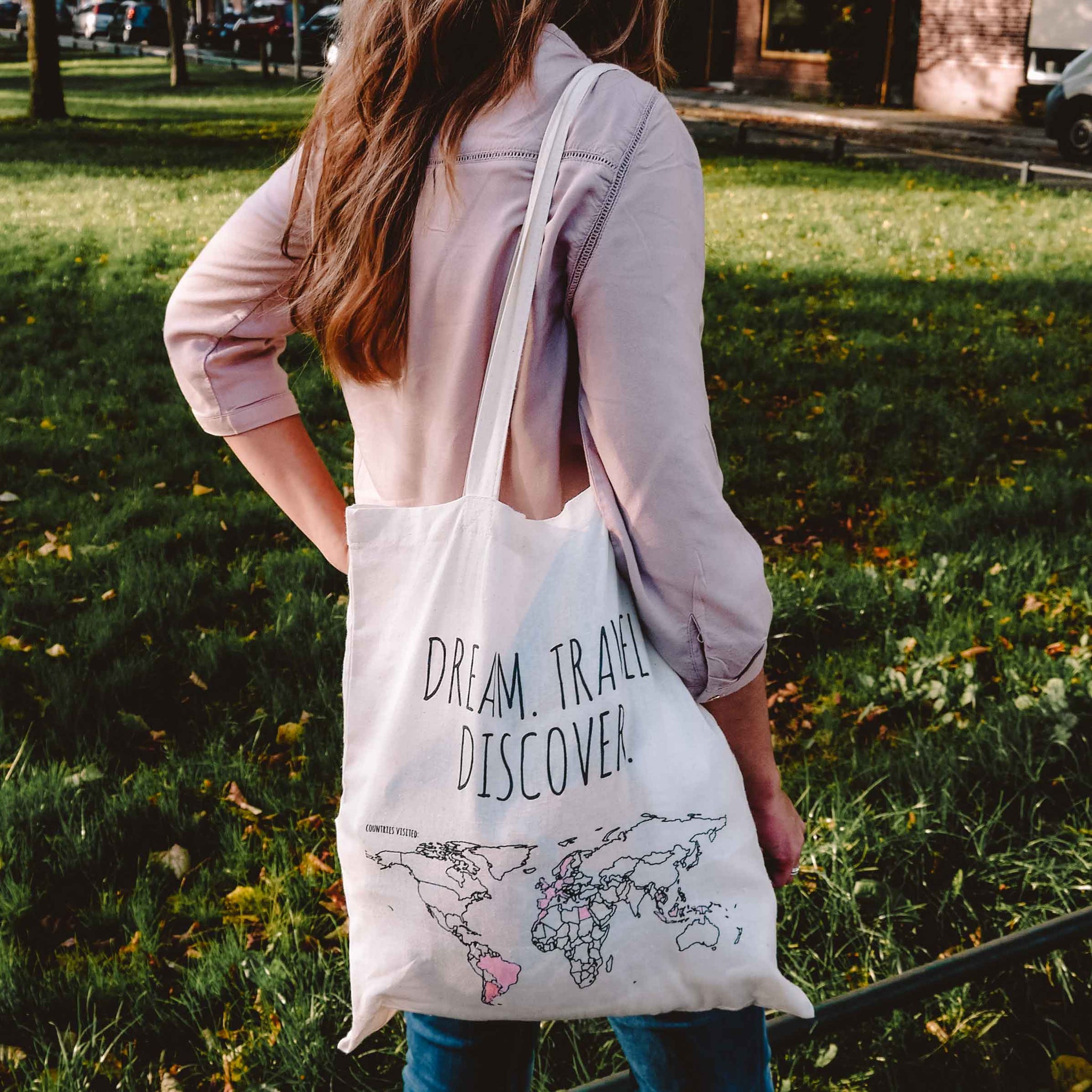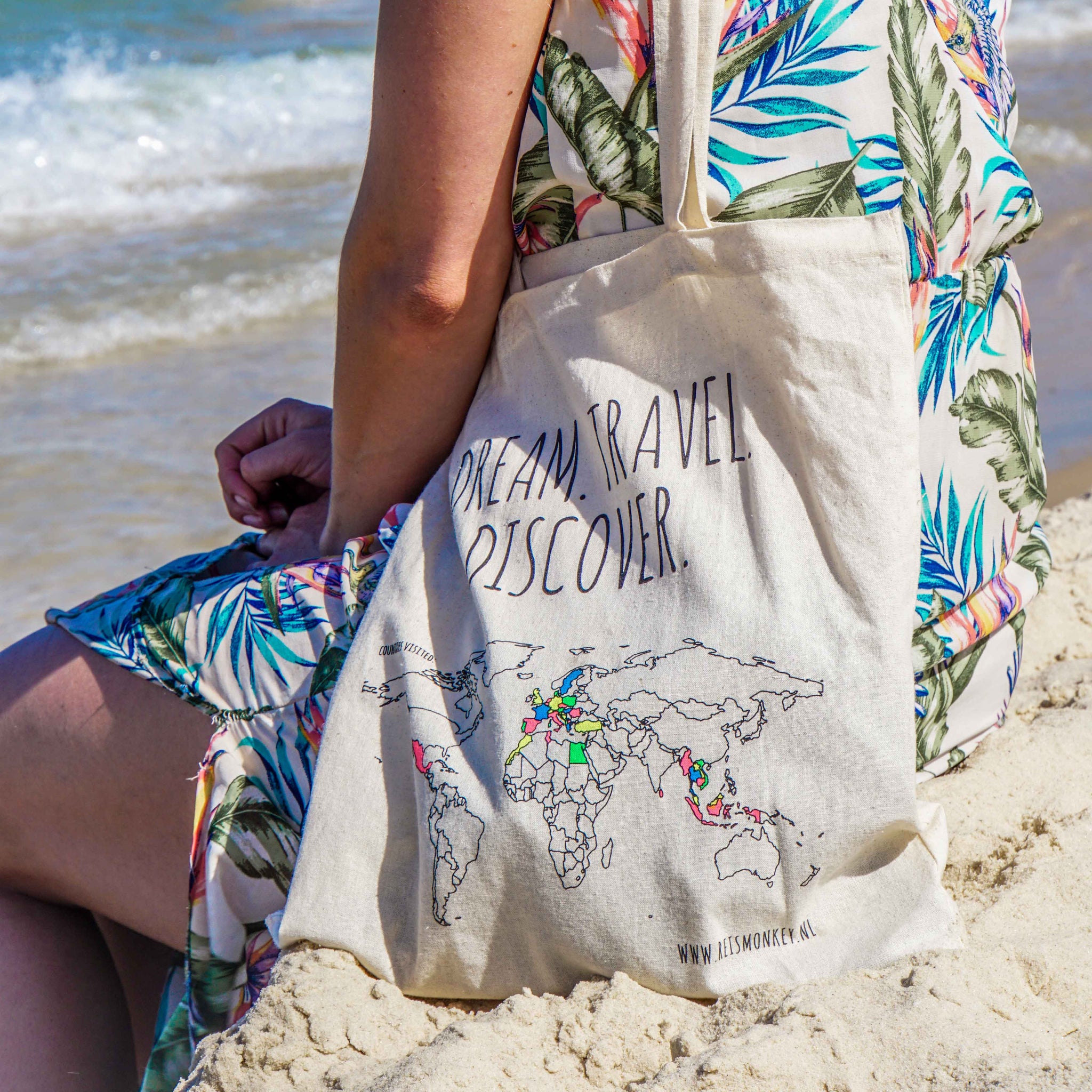 Diese Baumwolltasche gibt es exklusiv bei Reismonkey und eignet sich perfekt als Geburtstags- oder Abschiedsgeschenk für Reisende. Der Text „Träumen, Reisen, Entdecken“ passt perfekt dazu. Der Clou: Dein Reisefreund kann alle Länder, die er besucht hat, mit einem Marker ausmalen.