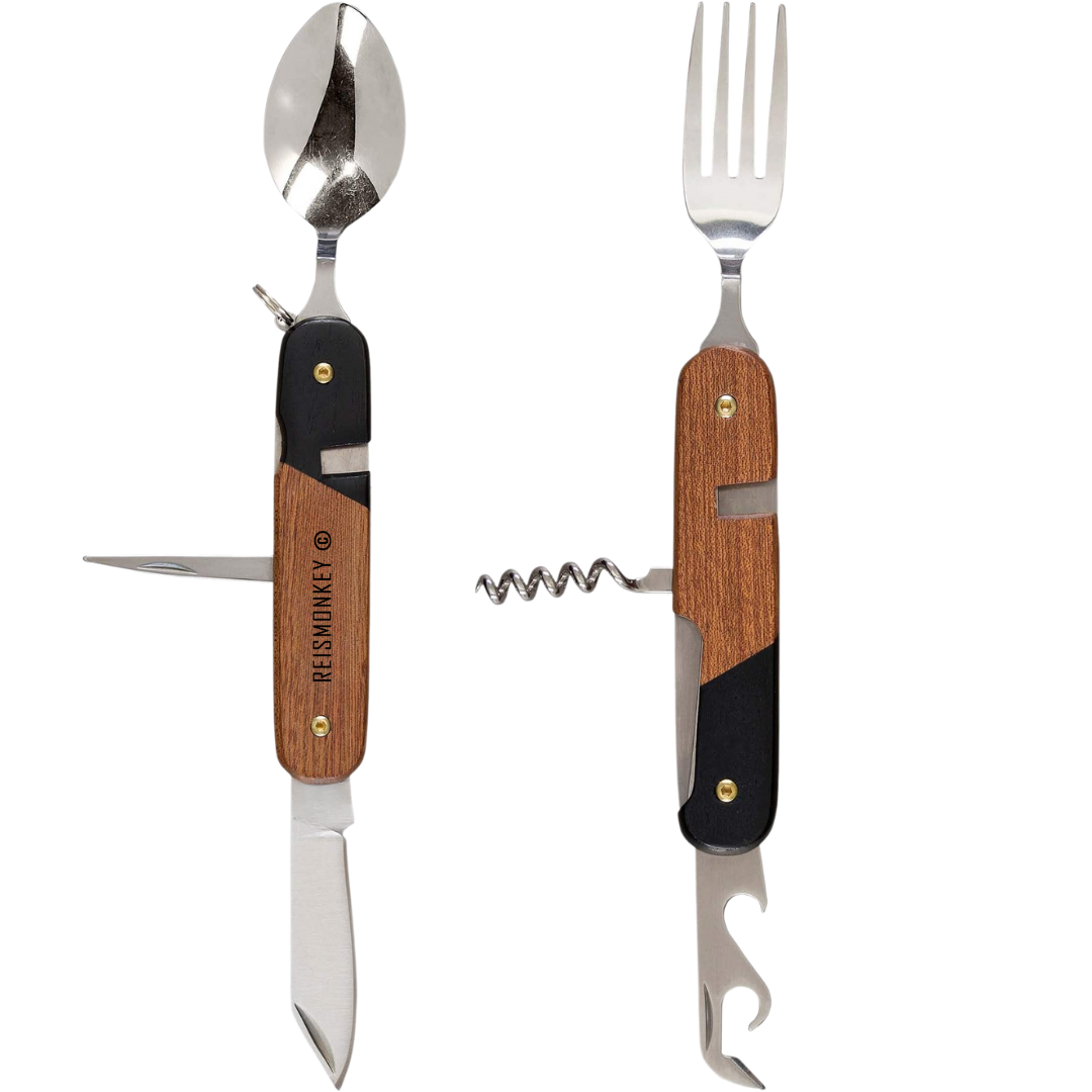 1. Deluxe 6-in-1 Reisebesteck-Multitool – 21,99 €: Diese Version hat ein schönes Holzfinish. Dieses besonders umfassende Werkzeug enthält folgende Komponenten: ein scharfes Messer, eine Gabel, einen Löffel, einen Korkenzieher, einen Flaschenöffner und eine scharfe Mittelklinge. Jedes Teil lässt sich nahtlos in die schöne Holzmitte falten. Die Holzoptik verleiht ihm ein robustes Aussehen. Diese Version wird mit einem praktischen Klettverschlussbeutel zur Aufbewahrung geliefert – das ultimative Geschenk für echte Abenteurer.
