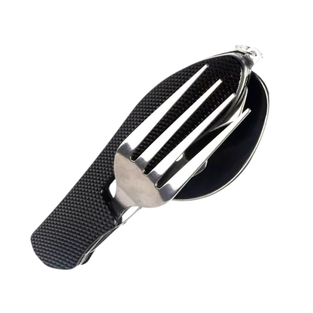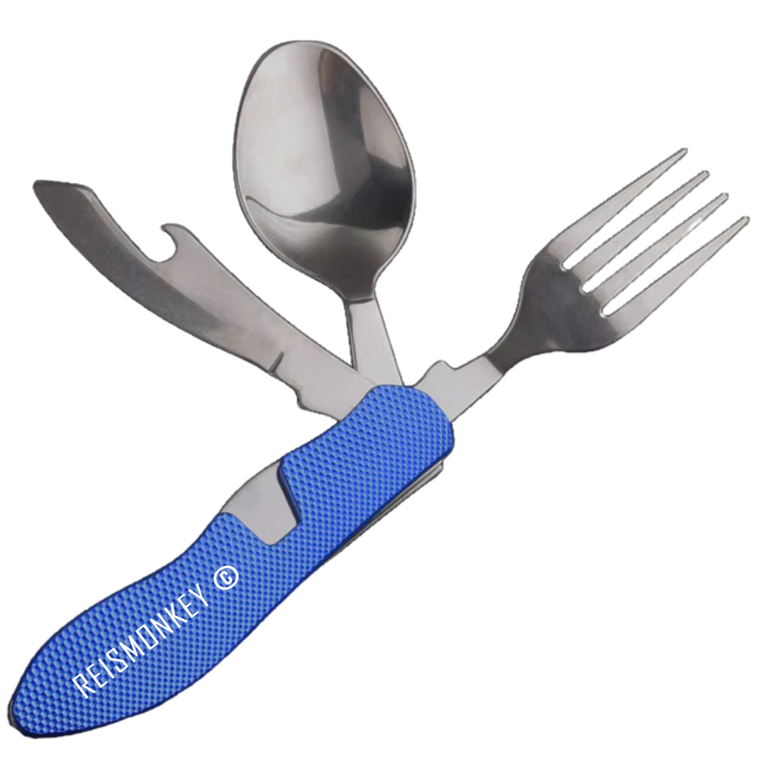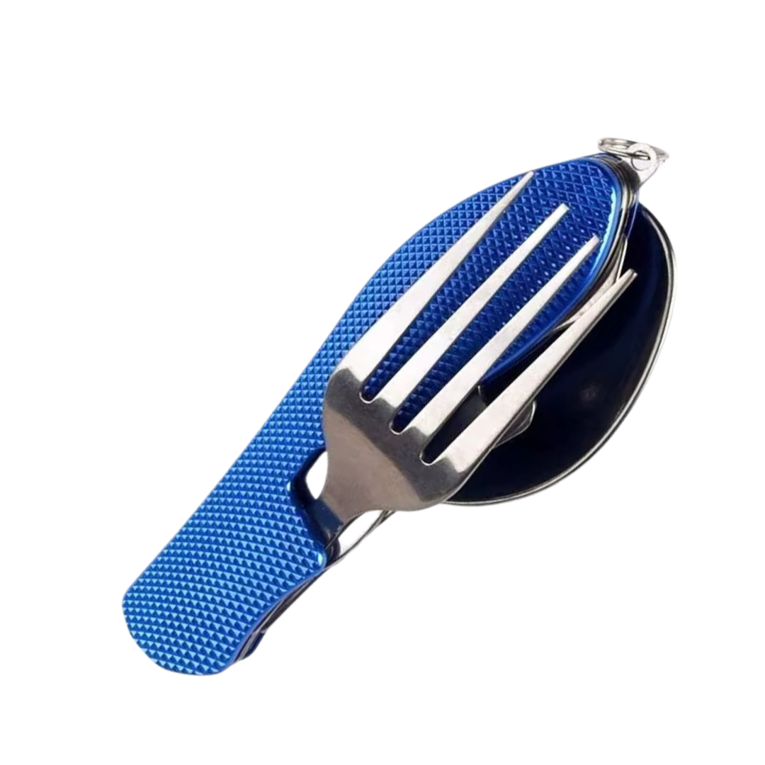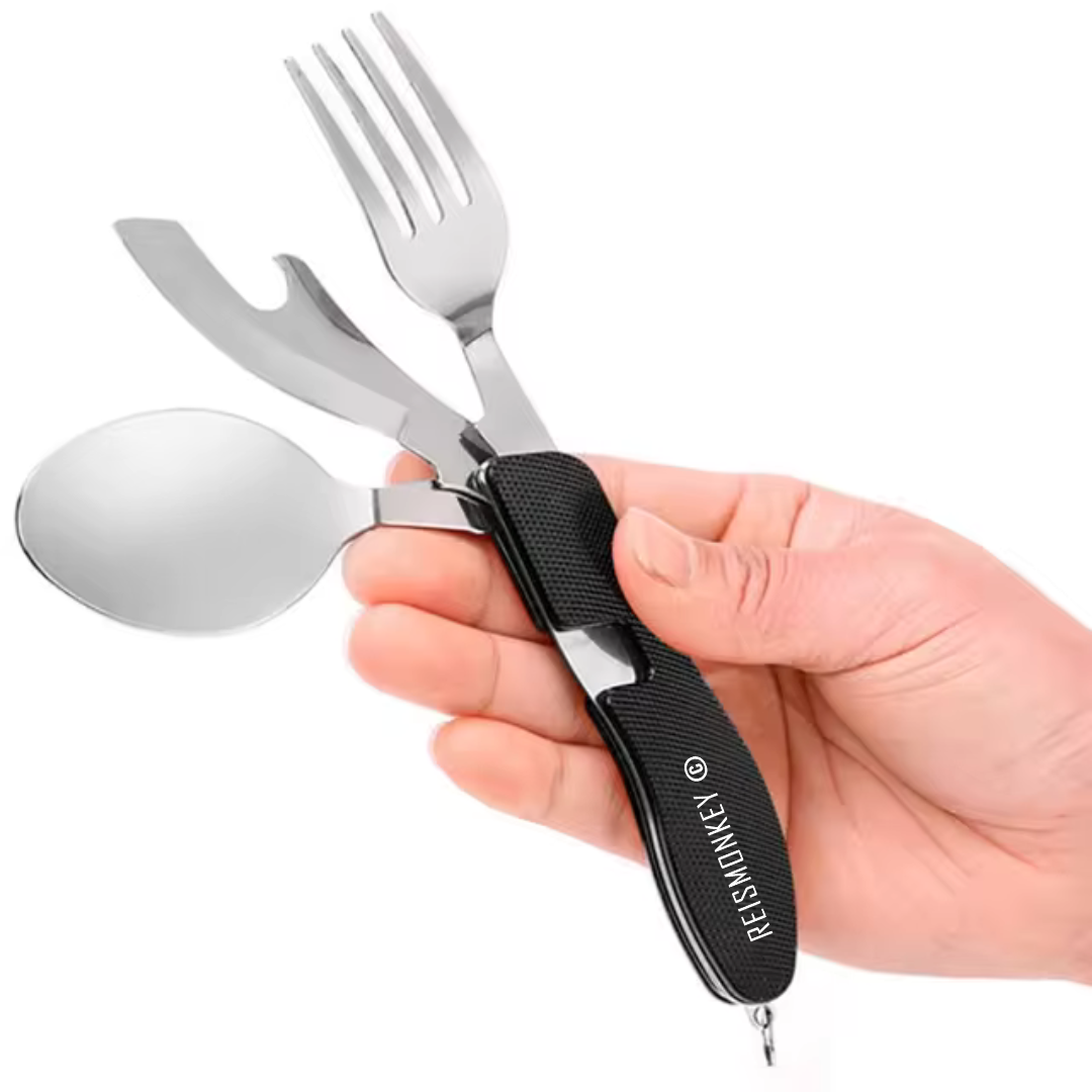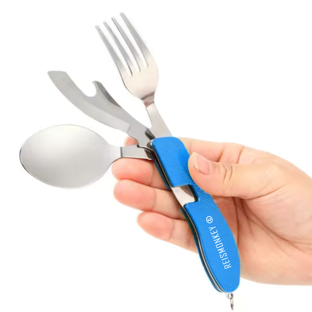2. Reisebesteck Multitool 4-in-1 – 14,99 €: Dieses 4-in-1 Reisebesteck-Multitool ist in Dunkelblau und Schwarz erhältlich. Dieses leichte Werkzeug bietet alles, was du für dein nächstes Abenteuer brauchst: Gabel, Löffel, Messer und Flaschenöffner. So bist du perfekt ausgestattet für deinen nächsten Campingausflug oder dein Picknick im Wald. Dieses Werkzeug eignet sich auch hervorragend als Geschenk für Reisefans!