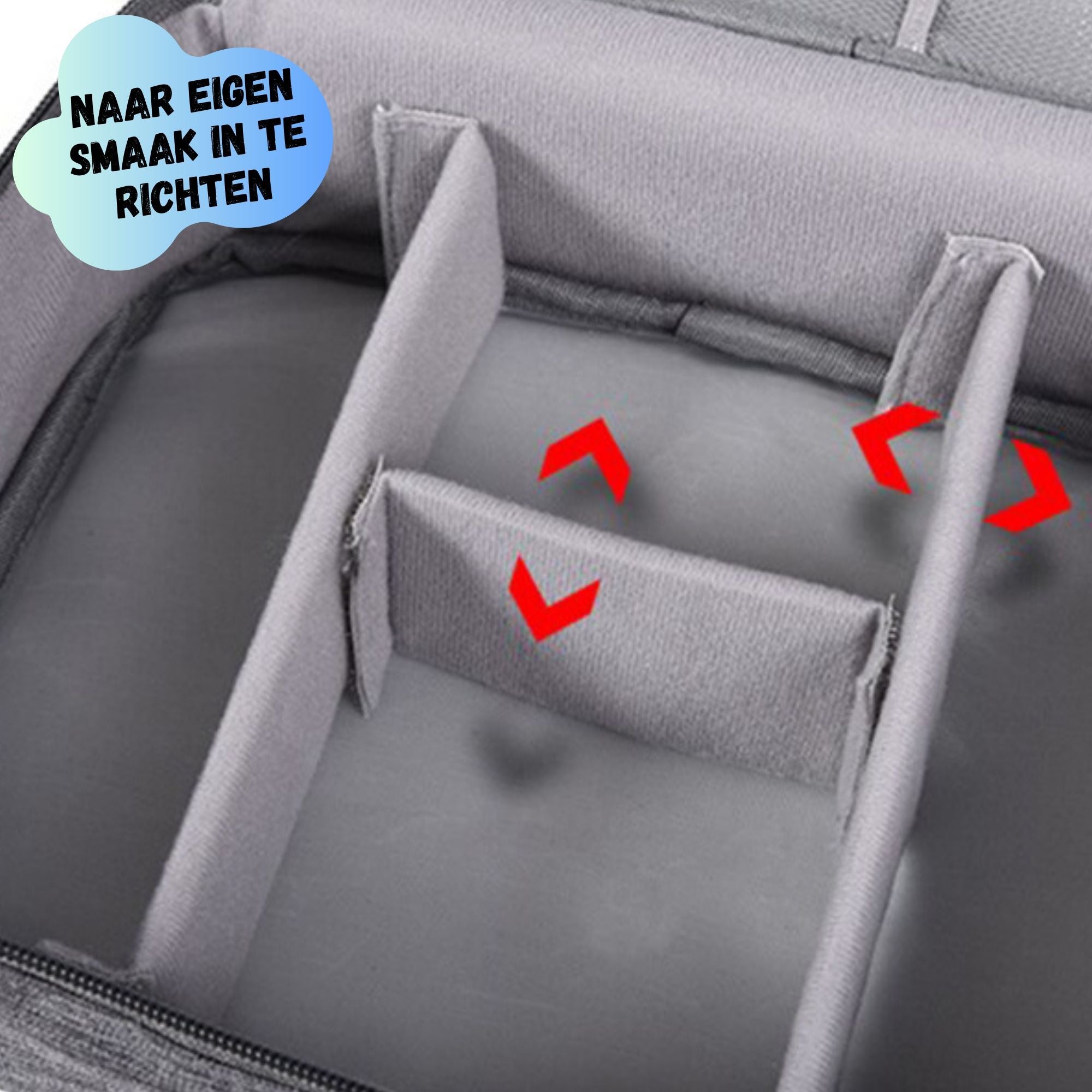Ruime tas met verstelbare stukken zodat alles er goed in past! Stevig en goede rits dikke stof en mooi van kleur (grijs). Erg tevrede met mijn aankoop!