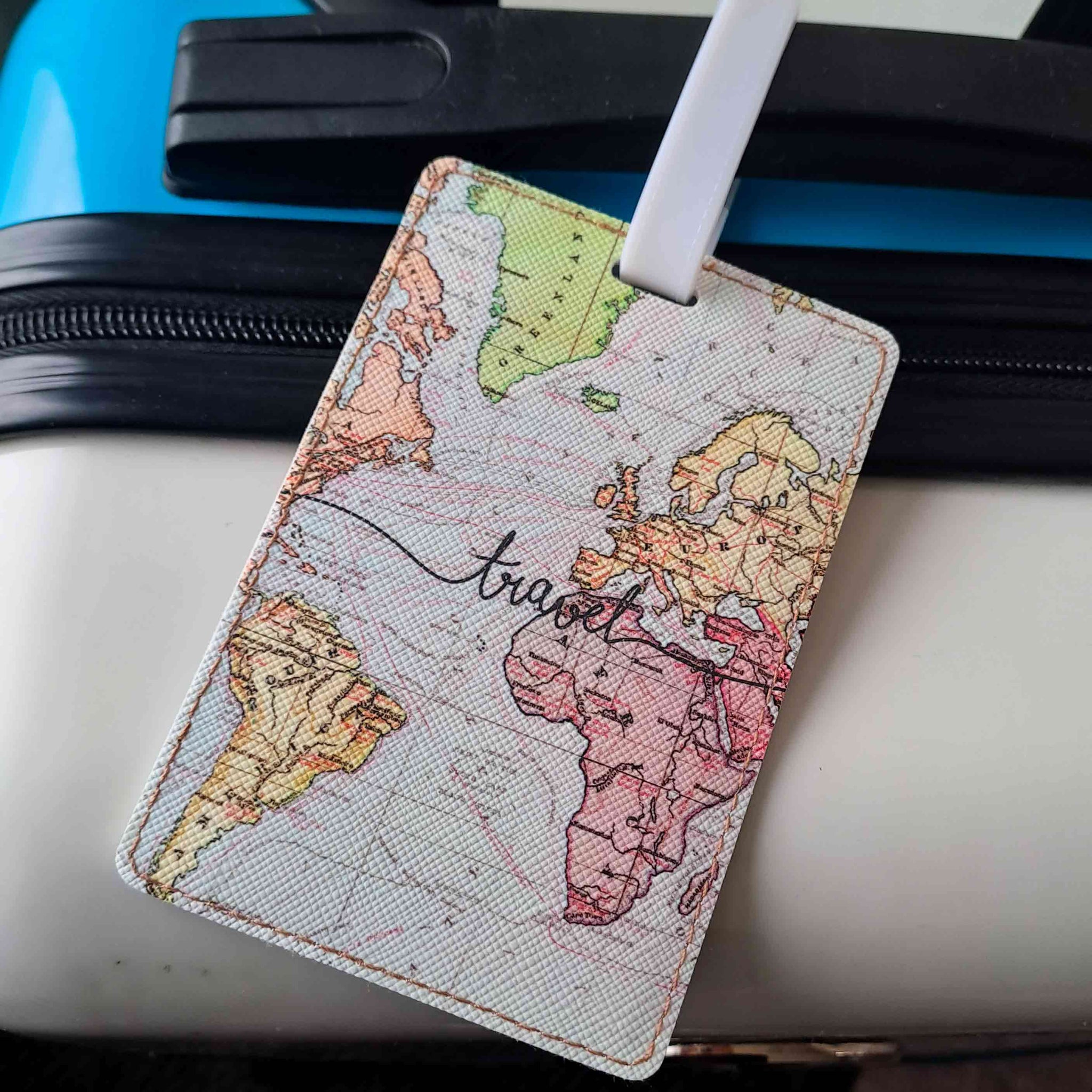 Das Design mit der Weltkarte und dem Schriftzug „Travel“ macht diesen Gepäckanhänger zu einem echten Hingucker.
