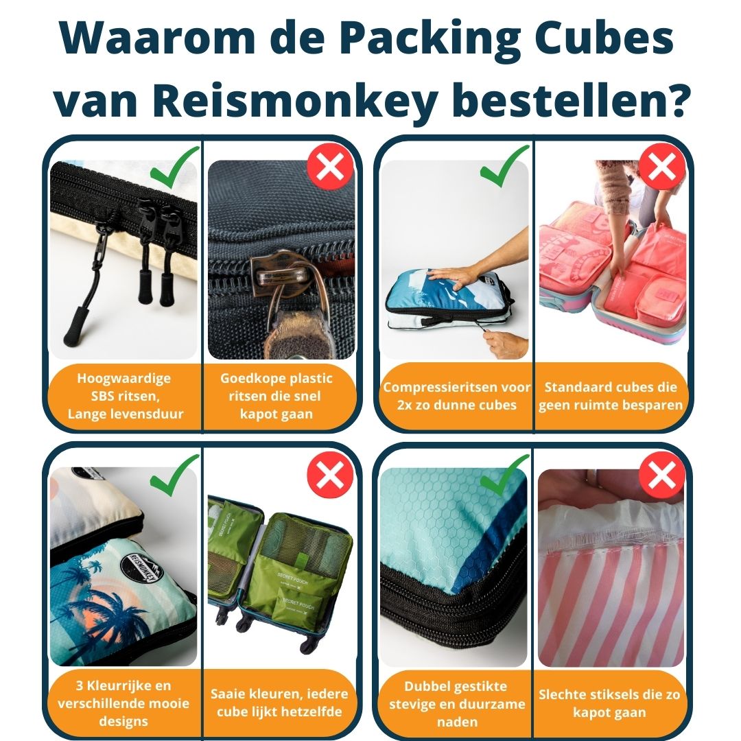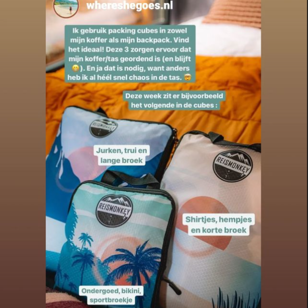 De packing cubes zijn super handig en het compressiesysteem werkt echt. De ritsen zijn stevig en het materiaal voelt ook stevig aan. Heerlijk om je reiskoffer zo te organiseren. En tevens zijn het leuke motieven waar je helemaal blij van wordt. Ik reis nooit meer zonder de packing cubes van Reismonkey.