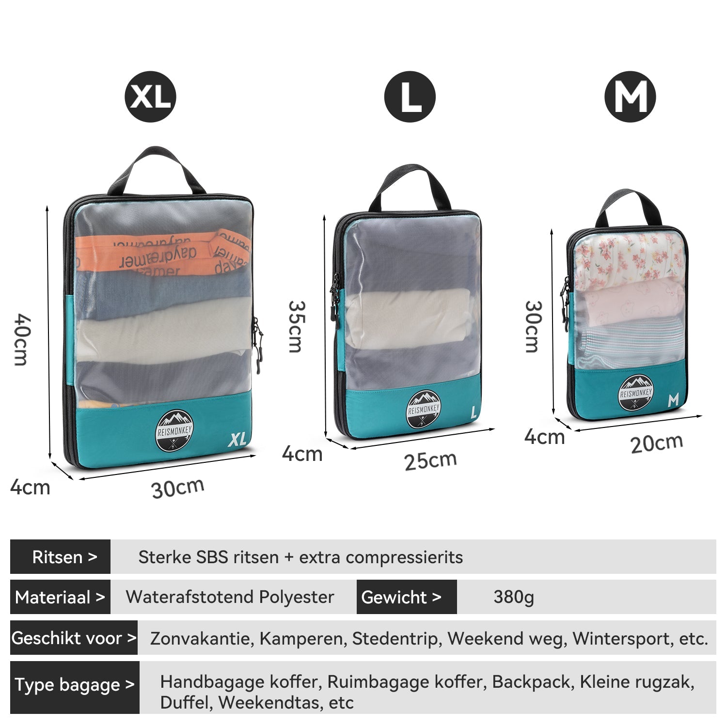 Möchtest du organisiert, kompakt und stressfrei reisen? Mit Kompressions-Packing Cubes reist du bis zu doppelt so kompakt wie mit herkömmlichen Würfeln. Diese robusten und leichten Cubes machen das Reisen deutlich entspannter! Deine Kleidung bleibt in den Kompressions-Packing Cubes stets knitterfrei und geordnet – so reist du wie ein Profi.