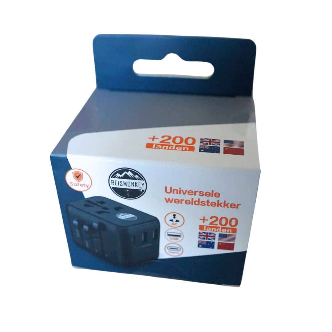 Dieser praktische Universal-Weltadapter funktioniert in über 200 Ländern. Egal, wo du unterwegs bist – mit diesem Reiseadapter hast du immer den passenden Stecker zur Hand. Neben der Steckdose verfügt der Adapter über zwei USB-Anschlüsse und einen USB-C-Anschluss, sodass du bis zu vier Geräte gleichzeitig laden kannst.